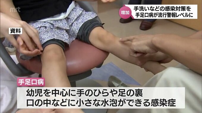 宮崎県内では、幼児を中心とした感染症「手足口病」の患者数が増加し、流行警報レベルを超えています。「手足口病」は、幼児を中心に手のひらや足の裏、口の中などに小さな水疱ができる感染症です。県によりますと…