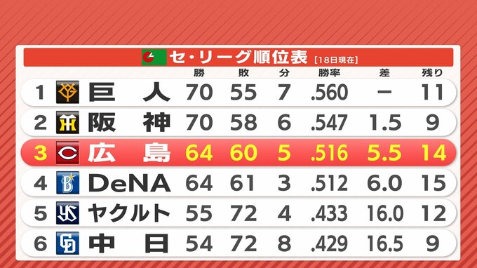 しかし、反撃もここまで。あと1点が重くのしかかり、あえなく敗戦。首位・巨人にマジック9が点灯、4位・DeNAには0.5ゲーム差に迫られる正念場を迎えました。(ヤクルト 5-4 広島)
