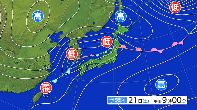 「秋雨前線」に加え台風14号・プラサンから変わる「温帯低気圧」で土日は九州から東北まで大雨のおそれ 雨と風シミュレーション 北陸放送 2024年9月20日(金) 09:52 国内 21日午後9時の予想天気図ですが、台風14号から変わった温帯低気圧は朝鮮半島にあり、秋雨前線に取り込まれる形になり、日本海を東に進むでしょう。 21日(土)午後9時の予想天気図 前線は東シナ海から日本海、そして東北を通り日本の東海上へとのびる見込みです。