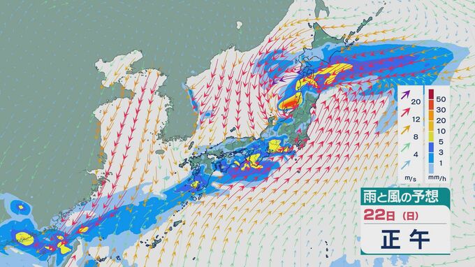 前線の南下、それに低気圧が日本海を進むことにともない22日は九州から東北まで広い範囲で雨と風ともに強まりそうです。