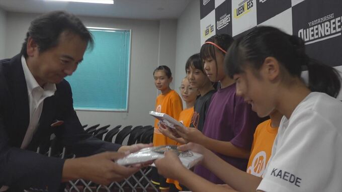 19日は贈呈式が行われ、トヨタカローラ山梨の茂木喜嗣社長が山梨県内のミニバス4チームに、来月19日と20日に行われる山梨クィーンビーズのホーム開幕戦の観戦チケット200枚と応援タオルを贈りました。