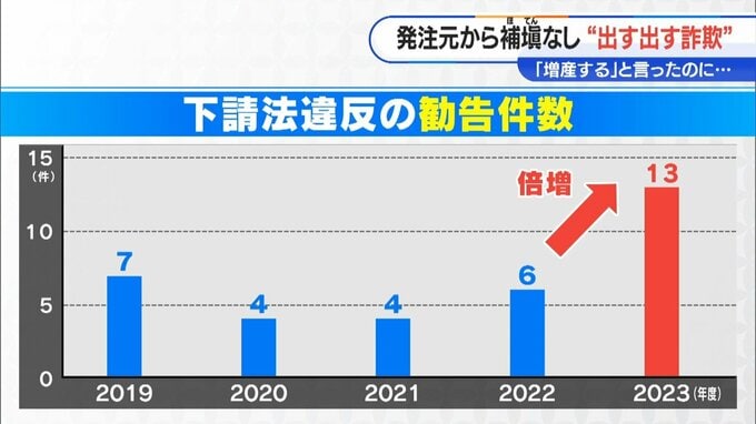 公正取引委員会が下請法違反を勧告した企業数は、2022年度までは毎年5社程度で推移してきました。しかし、2023年度は13社と前年の2倍に増加。これは、国が目指す「中小企業の賃上げ」を妨げる行為に、公正取引委員会が監視を強めていることが背景にあります。