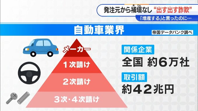 自動車に関わる企業は全国に約6万社。取引額は約42兆円にのぼりますが、立場が弱くなる中小零細になるほど、コストカットの圧力が増し、利益が少なくなるといういびつな構造になっています。