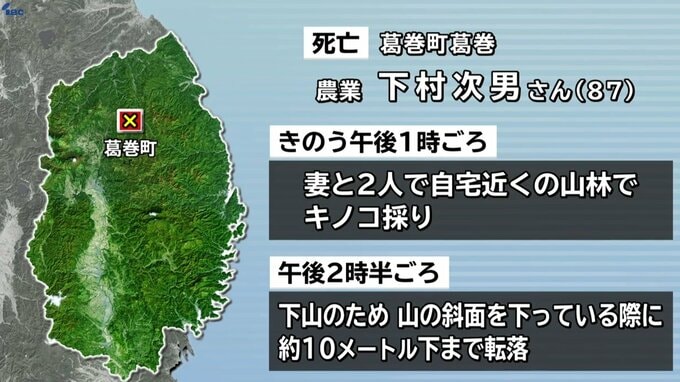 19日午後、葛巻町の山林でキノコ採りをしていた87歳の男性が斜面から転落し、死亡しました。亡くなったのは葛巻町葛巻の農業下村次男さん87歳です。警察によりますと、下村さんは19日午後1時ごろから妻と2人で自宅…