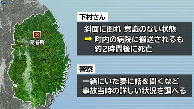 救急隊が現場に駆けつけた際、下村さんは斜面に倒れていてすでに意識がない状態で、町内の病院に運ばれましたが通報からおよそ2時間後に死亡が確認されました。
