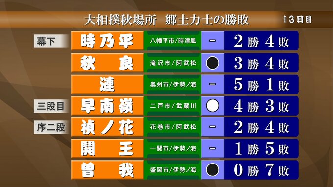大相撲秋場所13日目、郷土力士の取り組みの結果です。