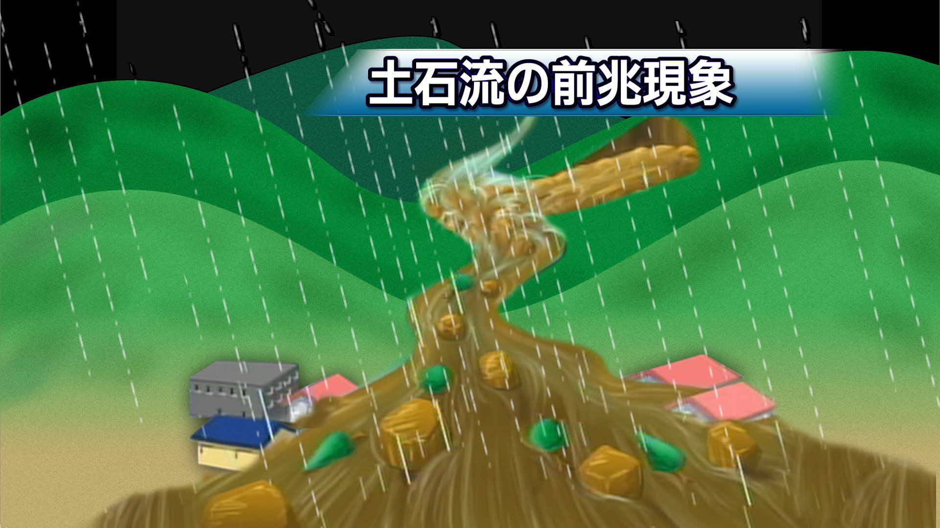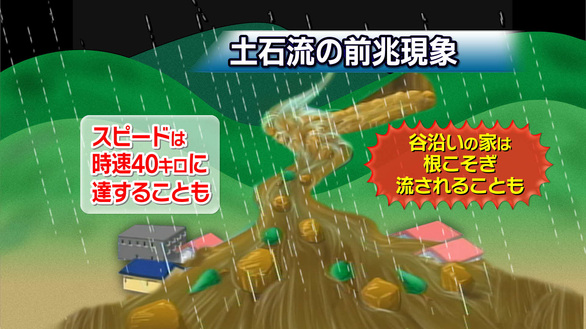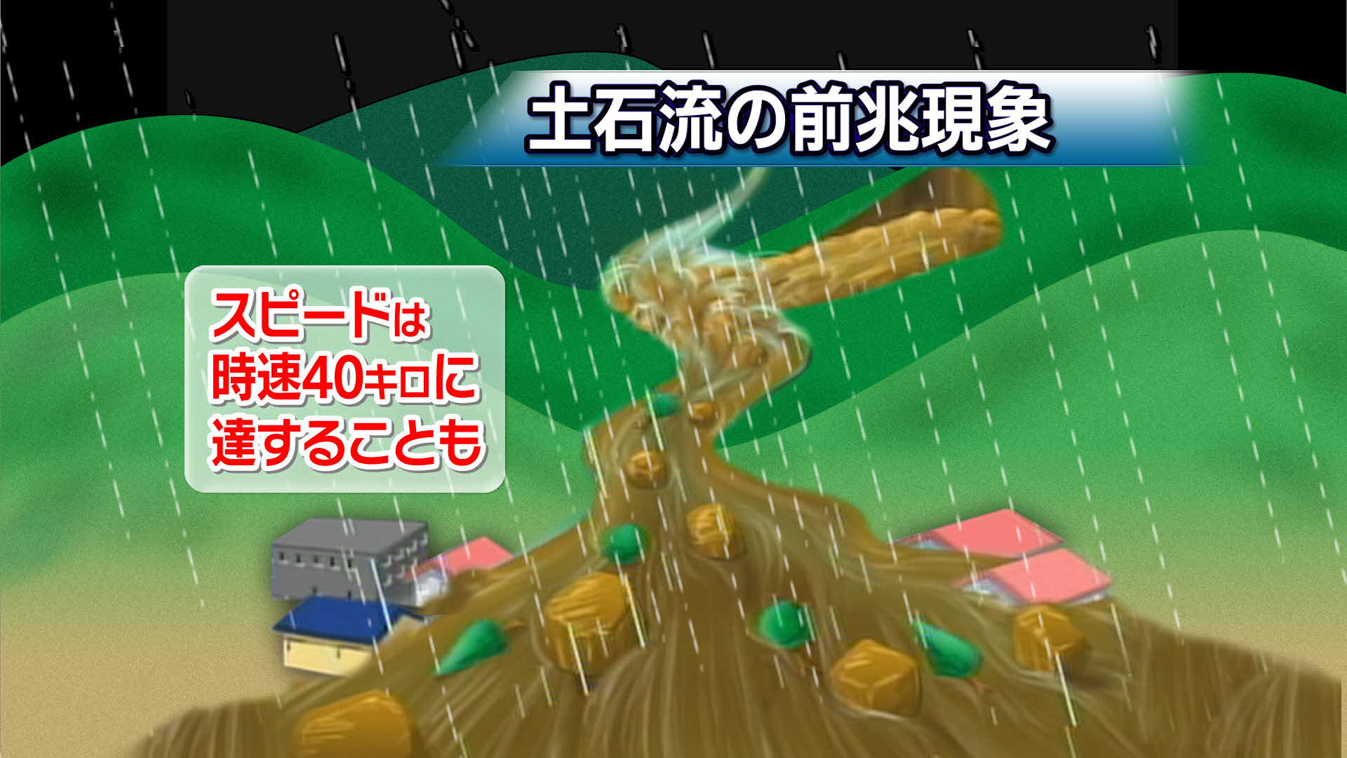 土石流のスピードは時速40キロに達することもあります。土石流から逃げるときは、下流方向にでは無く、横に逃げて、川からできるだけ離れてください。