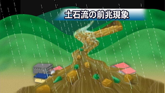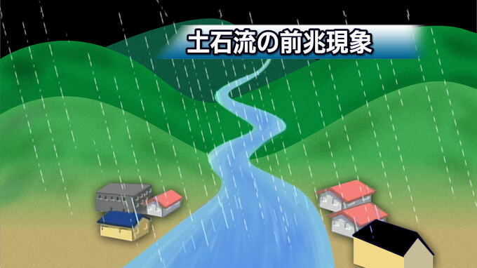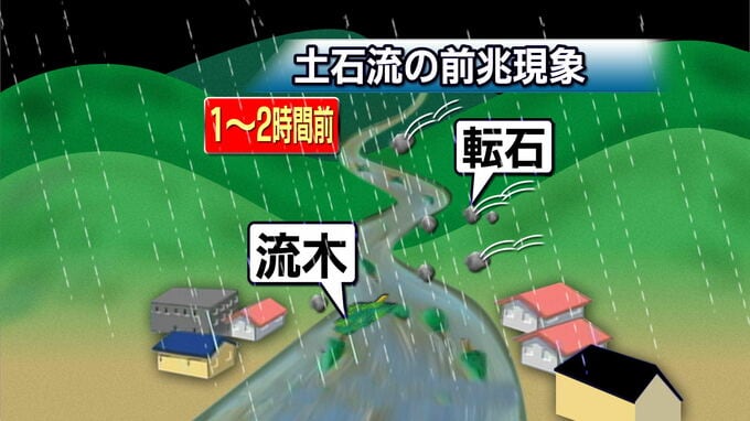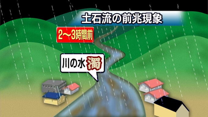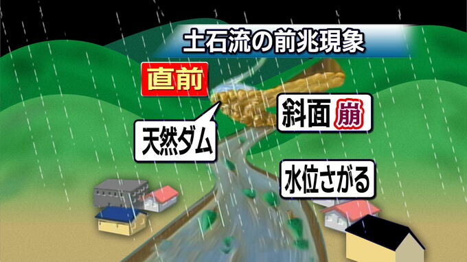 土石流発生直前には、上流に土砂や木々がたまり、水をせき止める天然ダムができ、水位が下がる。