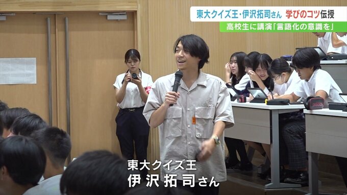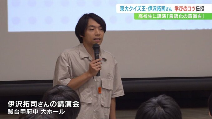 「東大王」伊沢拓司さんが高校生にサプライズ講演 オリジナルのクイズ出題や学びのコツを伝授 テレビ山梨 2024年9月20日(金) 20:00 国内 人気番組「東大王」などで活躍する伊沢拓司さんの講演会が甲府市で開かれました。 駿台甲府高校1年生の前にサプライズで登場したのは、会社経営者で東大クイズ王の伊沢拓司さんです。 伊沢さんはまず生徒たちにオリジナルのクイズを出題しました。