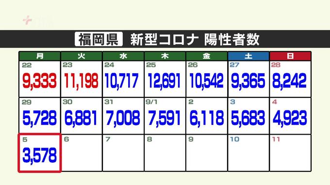 新型コロナの感染状況です。福岡県では5日、新たに3578人の陽性が確認されました。4000人を下回るのは7月19日以来となります。県内の発表自治体別の内訳は、福岡市が682人、北九州市が430人…