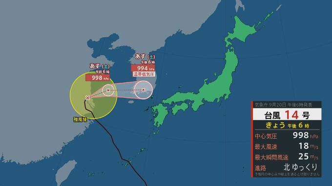 台風14号は20日(金)午後6時現在、華中にあって北にゆっくりと進んでいます。中心気圧は998ヘクトパスカル、中心付近の最大風速は18メートルです。