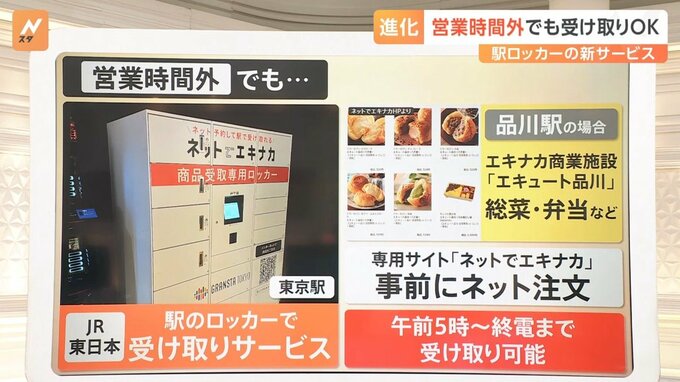 品川駅の場合、エキナカ商業施設「エキュート品川」で惣菜や弁当などを専用サイト「ネットでエキナカ」から事前にネット注文をしておくと、午前5時から終電まで、店舗の営業時間外でも受け取りが可能だというものです。