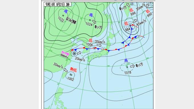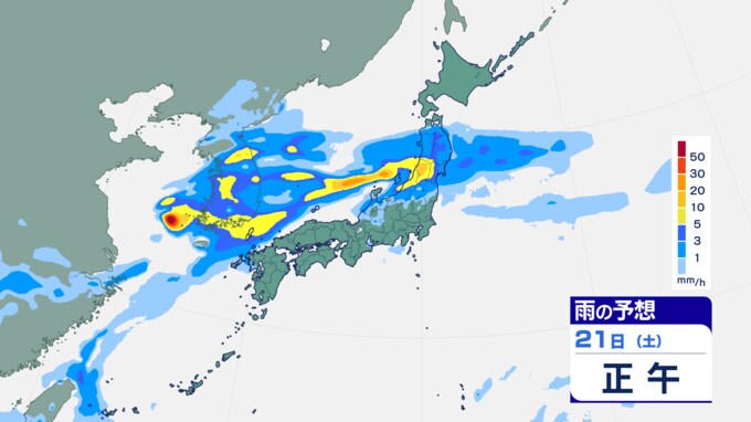 前線が黄海から東北地方を通り、日本のはるか東にのびています。前線上の日本海には低気圧があって、東に進んでいます。前線を伴った低気圧は、21日夜には東北地方の日本海側に進む見込みです。22日は、台風14号から変わった温帯低気圧が前線を伴って、日本海から日本の東へ進むでしょう。22日にかけて、東北地方と北陸地方では土砂災害や低い土地の浸水、河川の増水や氾濫に厳重に警戒し、東北地方と九州北部地方では暴風に警戒してください。また、落雷や竜巻などの激しい突風、降ひょうに注意してください。(21日05時30分 気象庁発表)