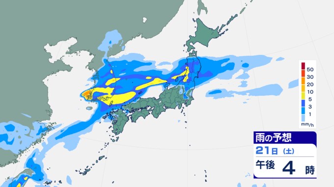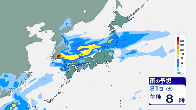 台風14号(プラサン)は21日午前3時には黄海にあって、1時間に20キロの速さで北東へ進んでいます。21日午後には温帯低気圧に変わる予想で、前線を伴って東へ進み、西日本から東北地方の広い範囲で22日にかけて、大雨となるおそれがあります。(21日午前)