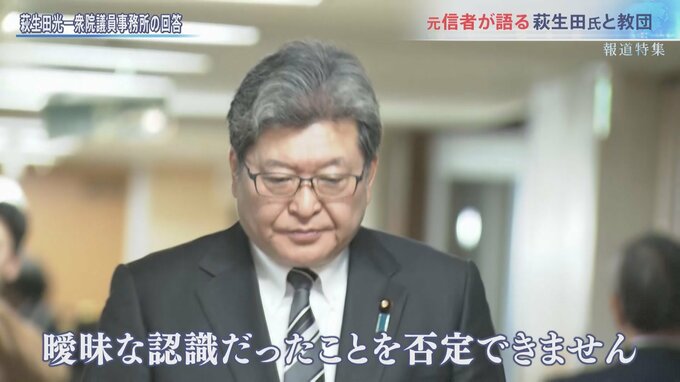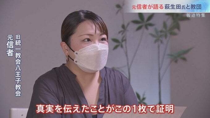 萩生田氏の地元、東京・八王子の旧統一教会の職員だった元信者の女性。これまで萩生田氏が八王子の教会を複数回、訪問したことなどを証言してきた。今回、証言についての覚悟を伝えるため、顔を出して取材に応じた。