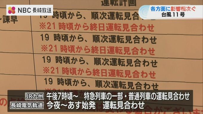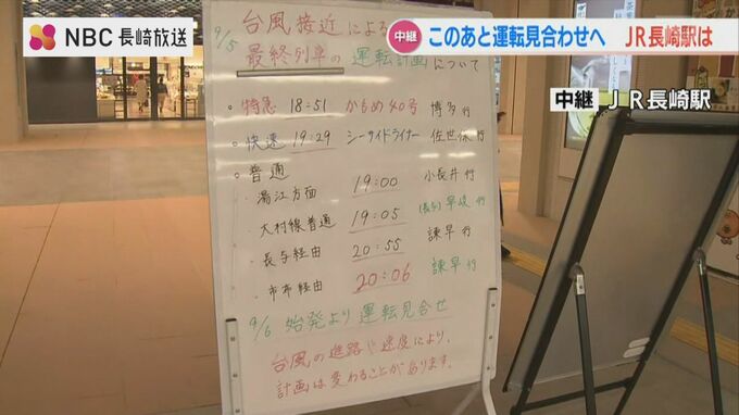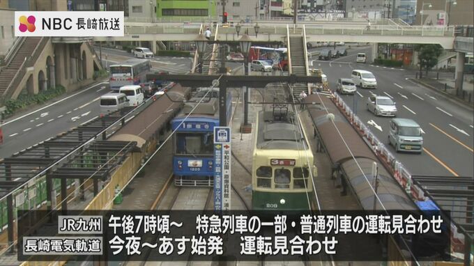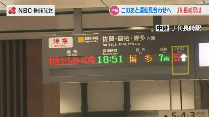 このあと長崎駅では、博多行の特急かもめが午後6時51分を最後に運転を見合わせるほか、佐世保行の快速シーサイドライナーも午後7時29分が最終となる予定です。