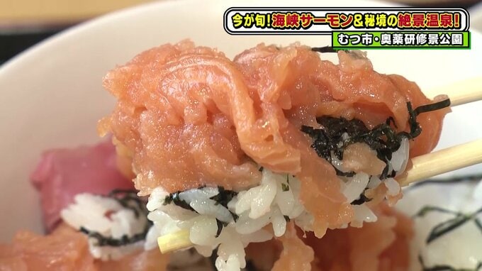「こちら『海峡サーモン丼』でございます。海峡サーモンというのは、津軽海峡で養殖されたニジマスのことを言いまして、青森には、“三大サーモン”があるんですけども、その1つです。何が言いたいかというと、うまいに決まってるじゃないですか!」