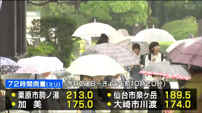今月20日からの72時間雨量は栗原市駒ノ湯で213ミリ仙台市の泉ヶ岳で189.5ミリ加美町で175ミリなどとなっています。