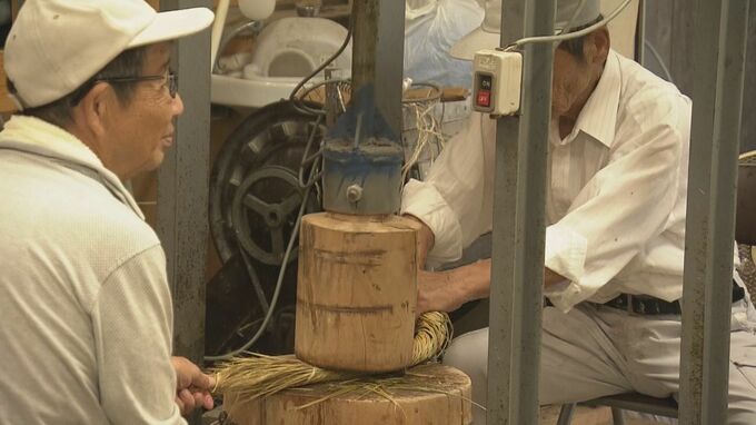 参加者たちは、稲わらをキネでたたいて柔らかくする「わら打ち」や編み込み作業などを分担して行い、夕方までに直径3センチ、長さ170メートルのお綱7本を作り上げます。