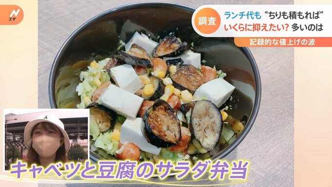 この日、キャベツと豆腐のサラダ弁当を作ったという20代の女性。キャベツ20円、豆腐25円、コーン20円、ウインナー40円、なす20円など、合計125円でした。