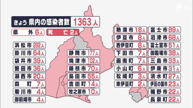 9月5日は、静岡県内で新たに1363人が新型コロナウイルスに感染したことが分かりました。感染のピークは過ぎたとみられていますが、引き続きの感染防止対策が呼びかけられています。新たな感染者を自治体別に見ます…