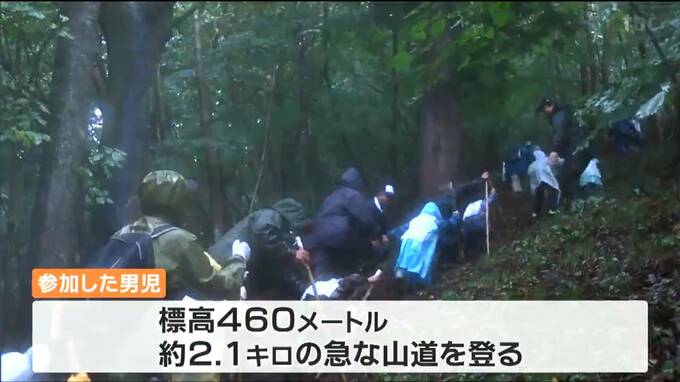 気仙沼市の羽田神社で行われた「お山がけ」には市内に住む男の子11人が参加しました。子どもたちは雨の中、標高460メートルおよそ2・1キロの急な山道を登りました。