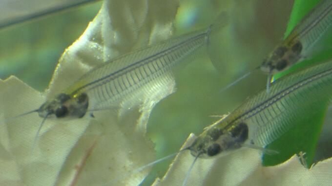 展示されている魚のうち、「トランスルーセントグラスキャット」は、体が透明で骨まで見えていてハロウィーンではなじみ深いガイコツを連想させます。