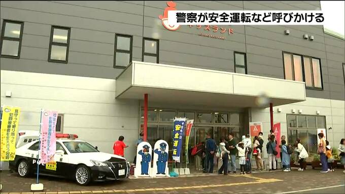 白石市福岡の「こじゅうろうキッズランド」では、23日午前、白石警察署の署員ら10人が家族連れらに安全運転を呼びかけるチラシや反射シールを配りました。