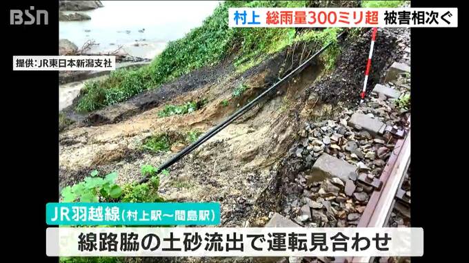 JR羽越線の村上~間島(まじま)駅間では、線路下の土砂が崩れ、この区間の運転が見合わされています。復旧の見通しは立っていないということです。