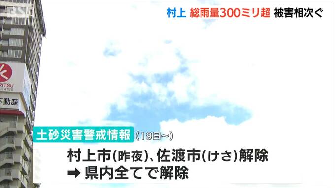 記録的な大雨のピークは越え、19日から県内各地に出されていた土砂災害警戒情報は村上市は22日夜、佐渡市は23日の朝に解除され、県内すべてで解除となりました。