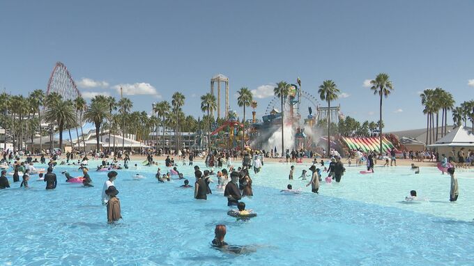 三重県桑名市のナガシマスパーランドのプールでは、朝から大勢の家族連れらが訪れ、にぎわいました。