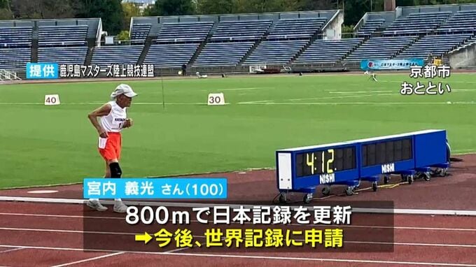 京都市で開かれた日本マスターズ陸上選手権で、大会最高齢の、鹿児島市の宮内義光さん(100)が、100歳から104歳までの部に出場。1500メートルでこれまでの記録を20秒余り更新し、世界新記録を達成しました。