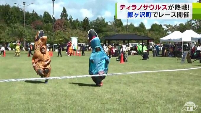 恐竜の着ぐるみを着て足の速さを競い合うティラノサウルスレースが青森県鰺ヶ沢町で行われ、色とりどりの恐竜たちが熱戦を繰り広げました。