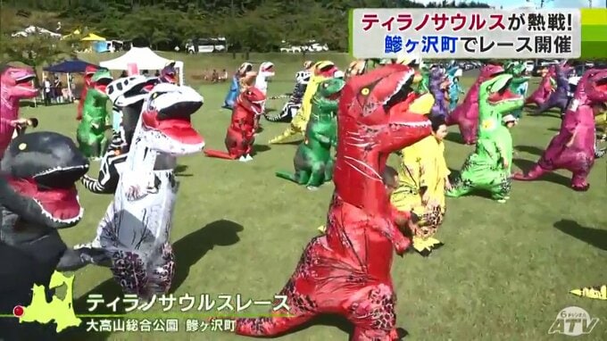 緑の芝生を埋め尽くすティラノサウルスの集団。鰺ヶ沢町の大高山総合公園で23日に行われたレースには、ティラノサウルスになりきった130人が参加しました。
