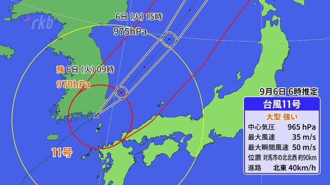 大型で強い台風11号は、6日午前6時現在、朝鮮半島付近を通過していて、暴風警報が九州北部のほぼ全域に発表されています。また、波浪警報が九州北部沿岸に出ています。大雨警報は佐賀市と唐津市と壱岐・対馬に…