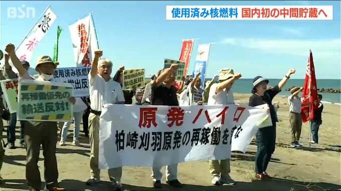 原発近くの海岸では、搬出に反対する市民団体が抗議の声を上げました。