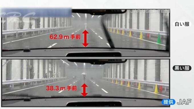 白い服の人は62.9メートル手前で認識できましたが、黒い服の人は38.3メートル手前になって認識、ドライバーが認識する時間に大きく違いが現れることが分かりました。