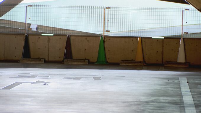 薄暗い屋内駐車場に止められた車の数十メートル先には色の違う三角コーンが並べられています。