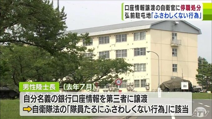 弘前駐屯地によりますと男性陸士長は2023年7月、自分名義の銀行口座情報を第三者に譲り渡し、自衛隊法に規定する隊員としての「ふさわしくない行為」に該当したということです。