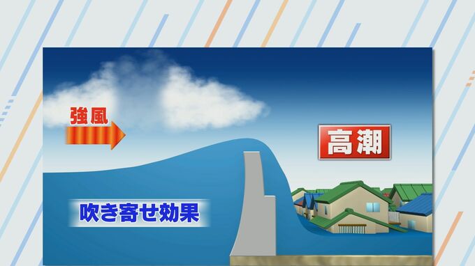 高潮は、台風や低気圧による「吸い上げ効果」で上昇した海水面に暴風が吹き付け、「吹き寄せ効果」で海岸付近の海面が異常に上昇する現象。