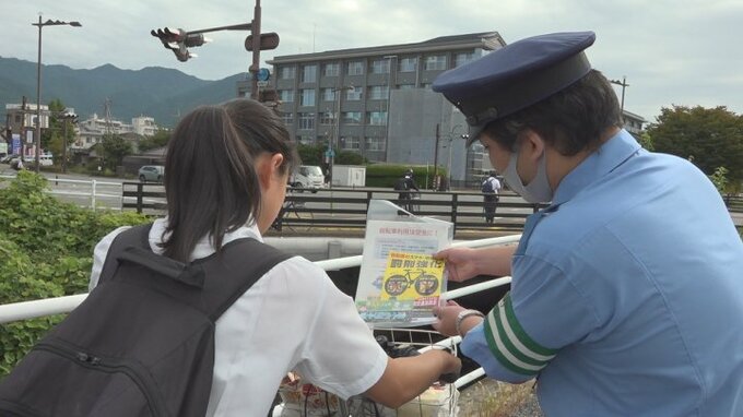 25日朝は甲府警察署の署員らおよそ20人が甲府工業高校前の交差点に立ち、自転車の利用者にチラシを配って、ヘルメットを着用していない時の致死率は着用時より3倍高いことなどを知らせました。