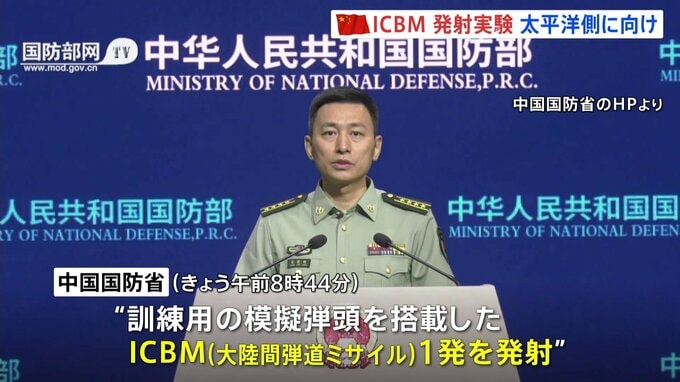 中国国防省は、ICBM=大陸間弾道ミサイルの発射実験を行ったと発表しました。中国国防省は、きょう午前8時44分、訓練用の模擬弾頭を搭載したICBM=大陸間弾道ミサイル1発を発射したと発表しました。太平洋の公海上…