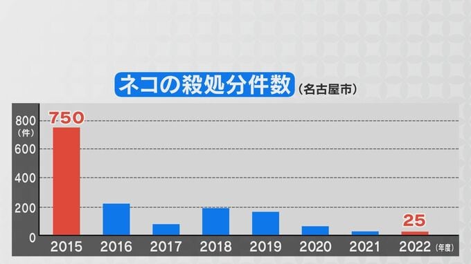 2016年から現在まで名古屋市の犬の殺処分数は0となっている一方、猫の殺処分は2015年に750匹。