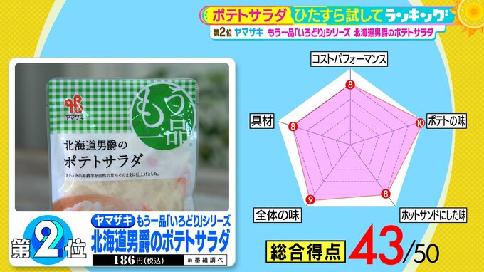 第2位は、ヤマザキの『もう一品「いろどり」シリーズ 北海道男爵のポテトサラダ』(税込186円 ※番組調べ)。