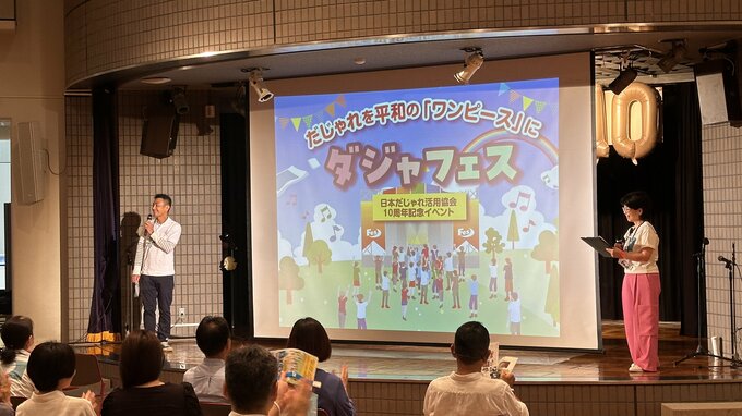 先日、協会設立10周年を祝うイベントがあるというので会場を覗いてみると、小学生からシニアまで様々な世代の人たちが大勢集まり、書道パフォーマンスや、だじゃれクイズ、だじゃれの数を競い合うスポーツ大会などバラエティ豊かなワークショップで大いに盛り上がっていた。