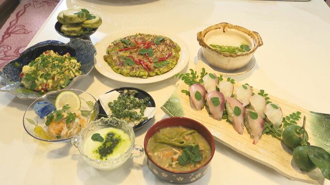 会では数々のモリンガ料理を試作。これまでにお好み焼きや団子汁、パウダーを混ぜた寿司など40近いレシピを考案、本も発行しています。