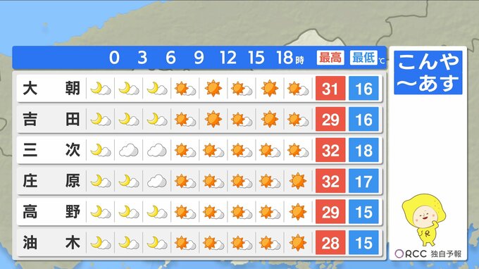 きょう25日(水)の広島県は、日差しが少なく午後を中心に雨が降った地点もありましたね。最高気温は生口島で31.1℃ 福山で30.3℃ 広島市中区で29℃でした。心地よい風もふいて、日中は比較的過ごしやすかったかと思います。