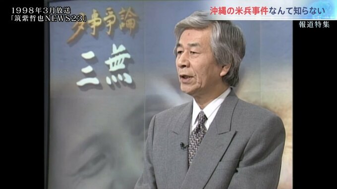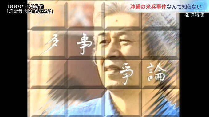 1998年3月放送の 「筑紫哲也NEWS23」。筑紫哲也キャスターの名物コーナー多事争論で筑紫さんは、本土の国民の沖縄への「無知」「無関心」「無感動」という3つの「無」が沖縄の変わらない状況をもたらしていると怒りをあらわに語っていた。