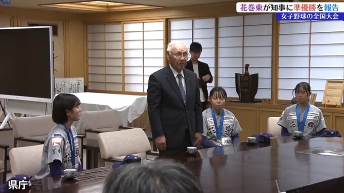 2024年の全国高校女子硬式野球選手権で準優勝した花巻東女子硬式野球部が岩手県庁を訪れ、達増拓也岩手県知事に大会結果を報告しました。