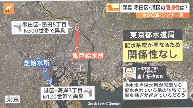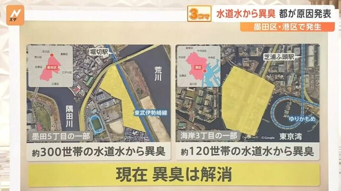 訴えがあった場所は、墨田区墨田5丁目の一部、約300世帯の水道水から異臭を確認、港区はゆりかもめ線の芝浦ふ頭駅近く、海岸3丁目の一部で約120世帯の水道水から異臭が確認されました。